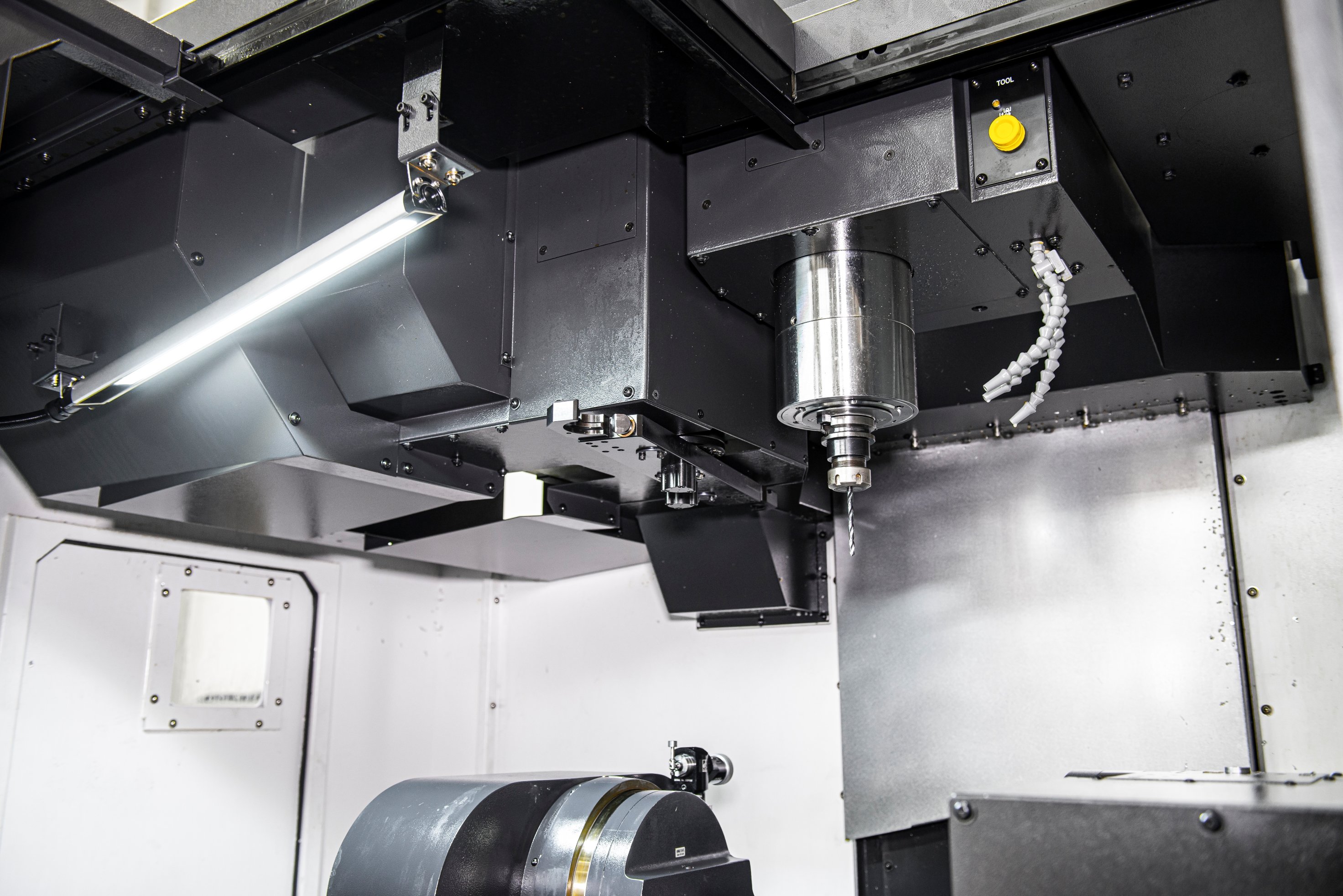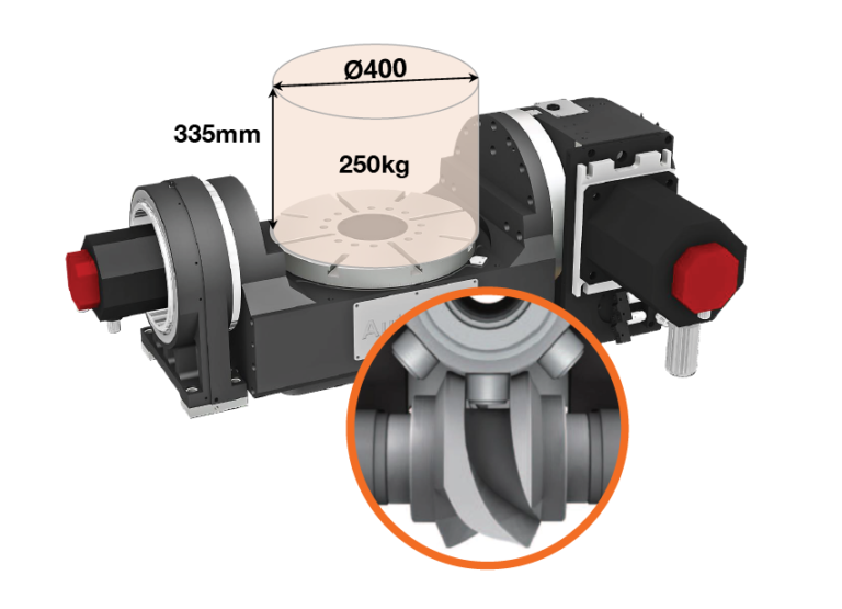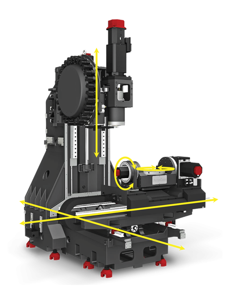 - Integrovaný otočno-sklopný stôl umožňuje simultánne riadenie piatich osí. Priame pohony rotačných osí zaisťujú plynulý chod, vysokú presnosť polohovania a opakovateľnosť pri výrobe zložitých tvarov, foriem a presných mechanických dielcov.
