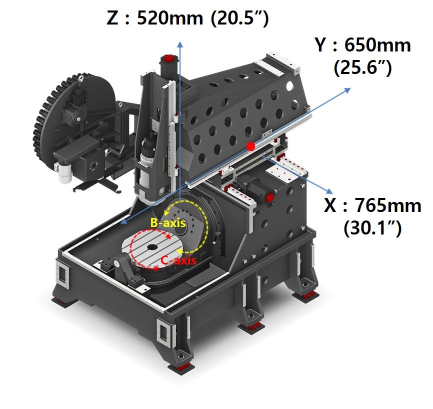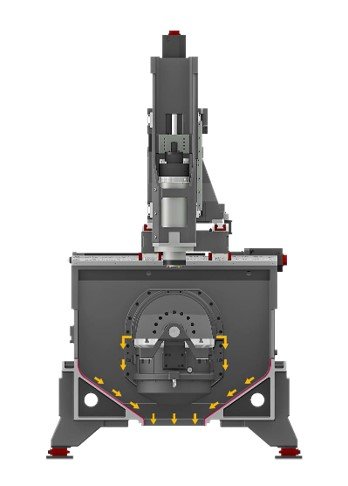 - Stroj je navrhnutý s dôrazom na maximálnu tuhosť pri zachovaní kompaktných rozmerov. Masívna základňa a optimalizovaná štruktúra rámu minimalizujú vibrácie a deformácie pri náročnom trieskovom obrábaní.