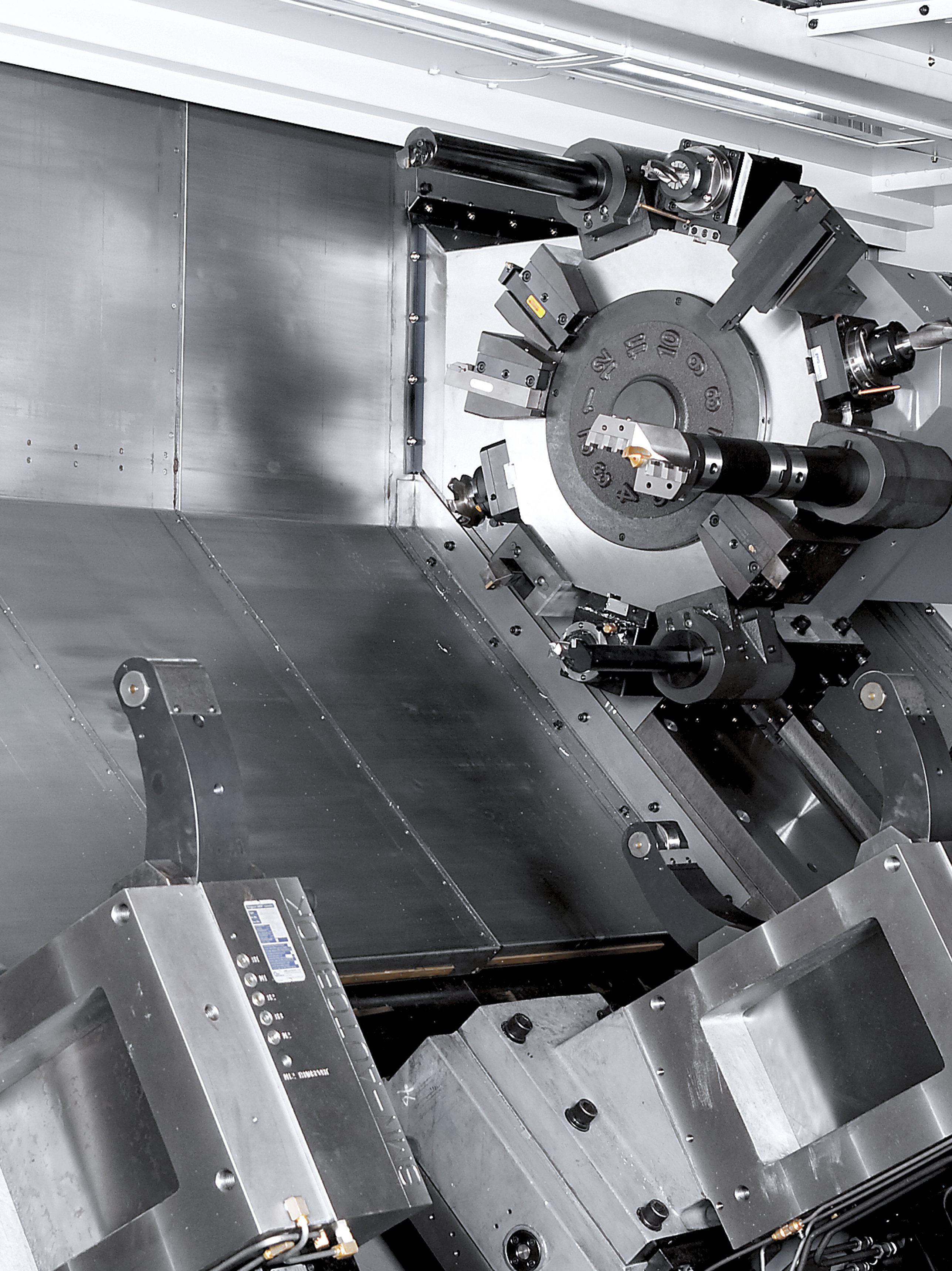 • Najväčší (12-polohový) revolver vo veľkostnej triede strojov L600/700 série umožňuje jednoduché a presné polohovanie. Systém držiakov nástrojov ponúka veľmi robustné a presné upnutie nástroja, čo minimalizuje vibrácie a zaisťuje vysokú presnosť obrábania, a to aj pri veľkom zaťažení.
