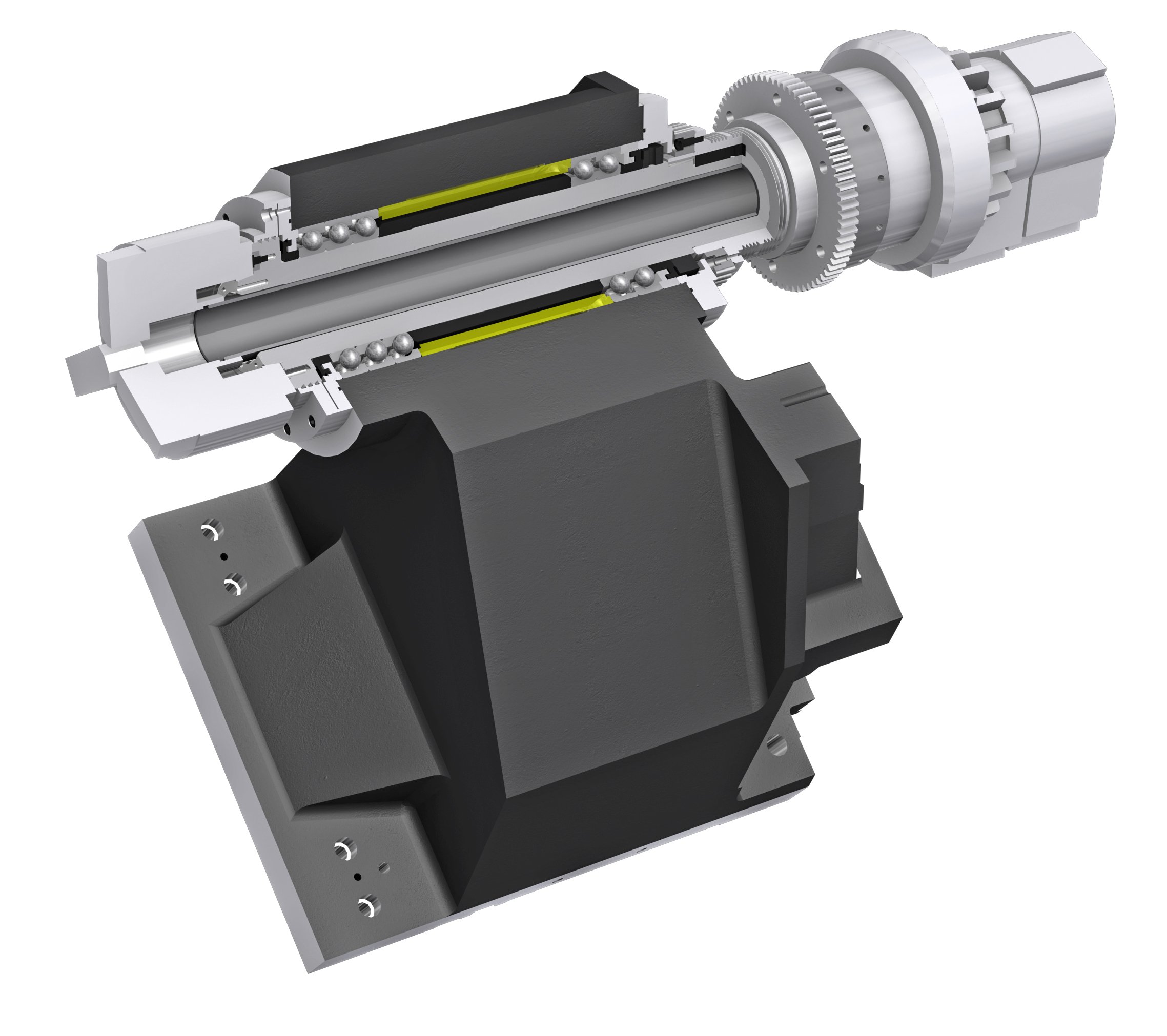 - Pre plnohodnotné využitie poháňaných nástrojov je vreteno vybavené „C“ osou s malým inkrementom polohovania 0,001°, a výkonnou hydraulickou brzdou, ktorá udržuje stabilné vreteno bez mikrovibrácií aj pri tvarovom frézovaní.
