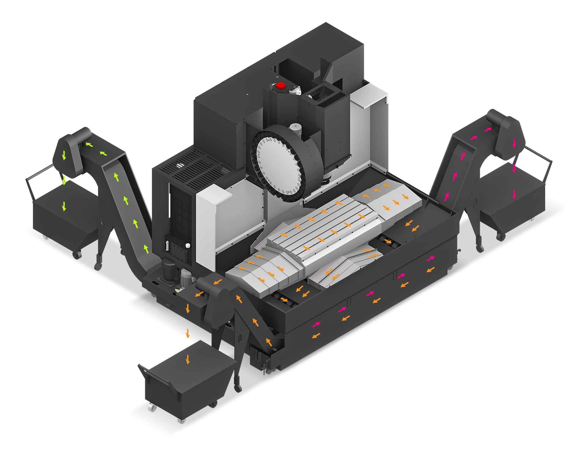 - V priebehu obrábania je možné využiť funkcie na prerušovaný chod dopravníka triesok (cyklovanie) a odsávanie olejovej hmly. Okrem úspory energie má cyklovanie dopravníka triesok veľký vplyv na spotrebu chladiacej kvapaliny, kedy sa striedajú fázy chodu a pokoja a tým umožňuje efektívne odtekanie chladiacej kvapaliny z triesok späť do nádrže stroja.