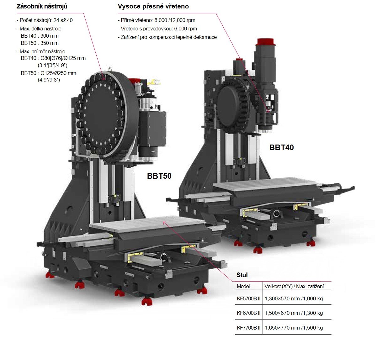 - HYUNDAI WIA KF5700B II je osadený vretenom s kužeľom BBT40, ktorý zaisťuje dvojitý kontakt medzi držiakom nástroja a vretenom – kužeľ aj čelo. Tento systém prináša vyššiu ohybovú tuhosť, stabilné upnutie a dlhšiu životnosť nástrojov. Vreteno je navrhnuté tak, aby bez problémov zvládlo ako ľahké dokončovacie operácie, tak aj náročnejšie odoberanie materiálu pri vysokých rýchlostiach.