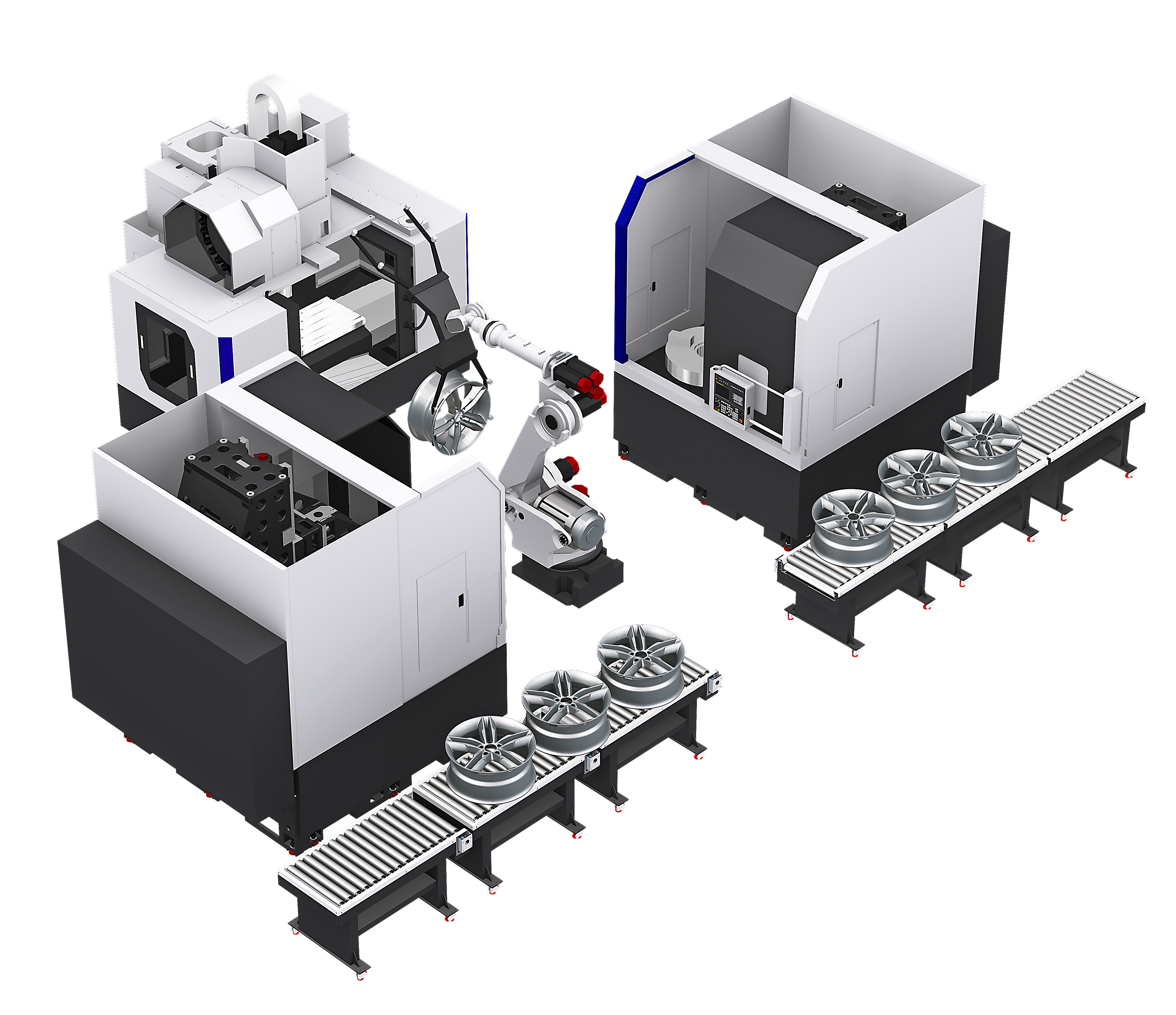 Hyundai WIA karusely řady LV - 2x pravý karusel (verze 'R') s robotem a linkou na obrábění slitinových disků kol pro automobilový průmysl