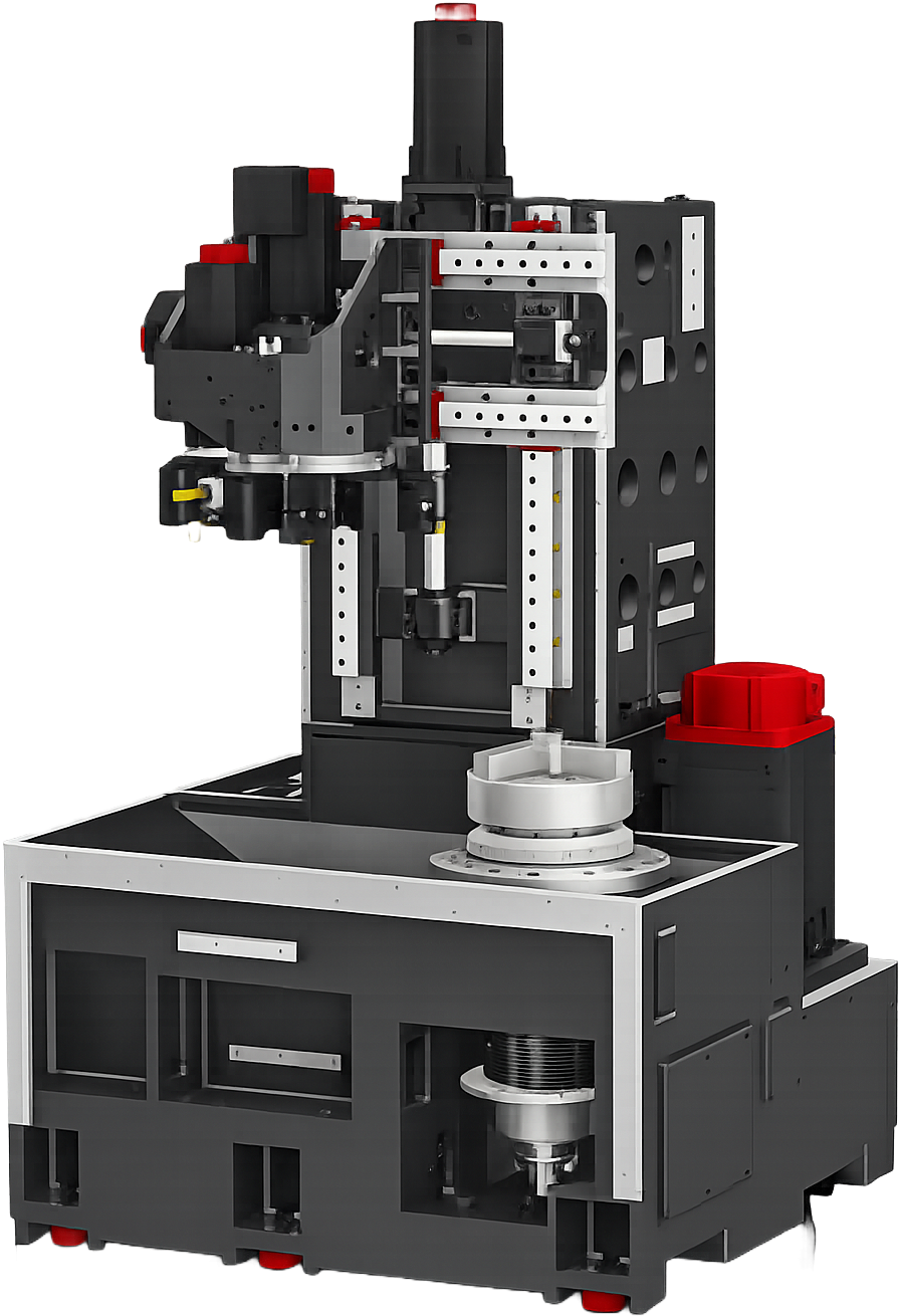 LV4500R je robustné vertikálne CNC sústružnícke centrum navrhnuté pre ťažké a presné obrábanie stredne veľkých obrobkov. Stroj je založený na masívnom liatinovom lôžku, ktoré zaisťuje vysokú tuhosť, stabilitu a účinné tlmenie vibrácií aj pri náročných hrubovacích operáciách. Konštrukcia je optimalizovaná pre dlhodobo stabilnú presnosť pri kontinuálnom zaťažení. Lineárne vedenia prispievajú k nízkemu treniu, vysokej dynamike posuvov a dlhodobej presnosti pri zachovaní kompaktných rozmerov stroja.