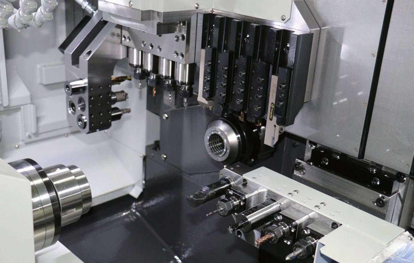 - Efektívne rozloženie nástrojových pozícií vrátane poháňaných nástrojov dosahujú extrémne rýchly výrobný čas. Dynamické protivreteno umožňuje komplexne vyrobiť výrobky bez ďalšej nutnosti prepínania kusu do ďalšieho stroja.